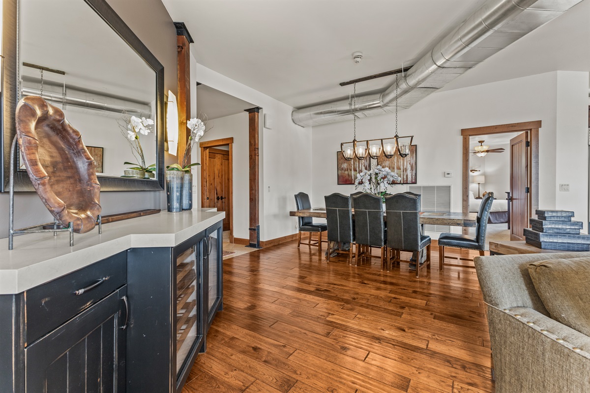 Spacious open living area with bar & wine fridge