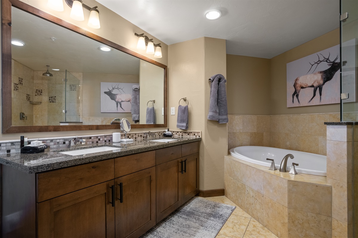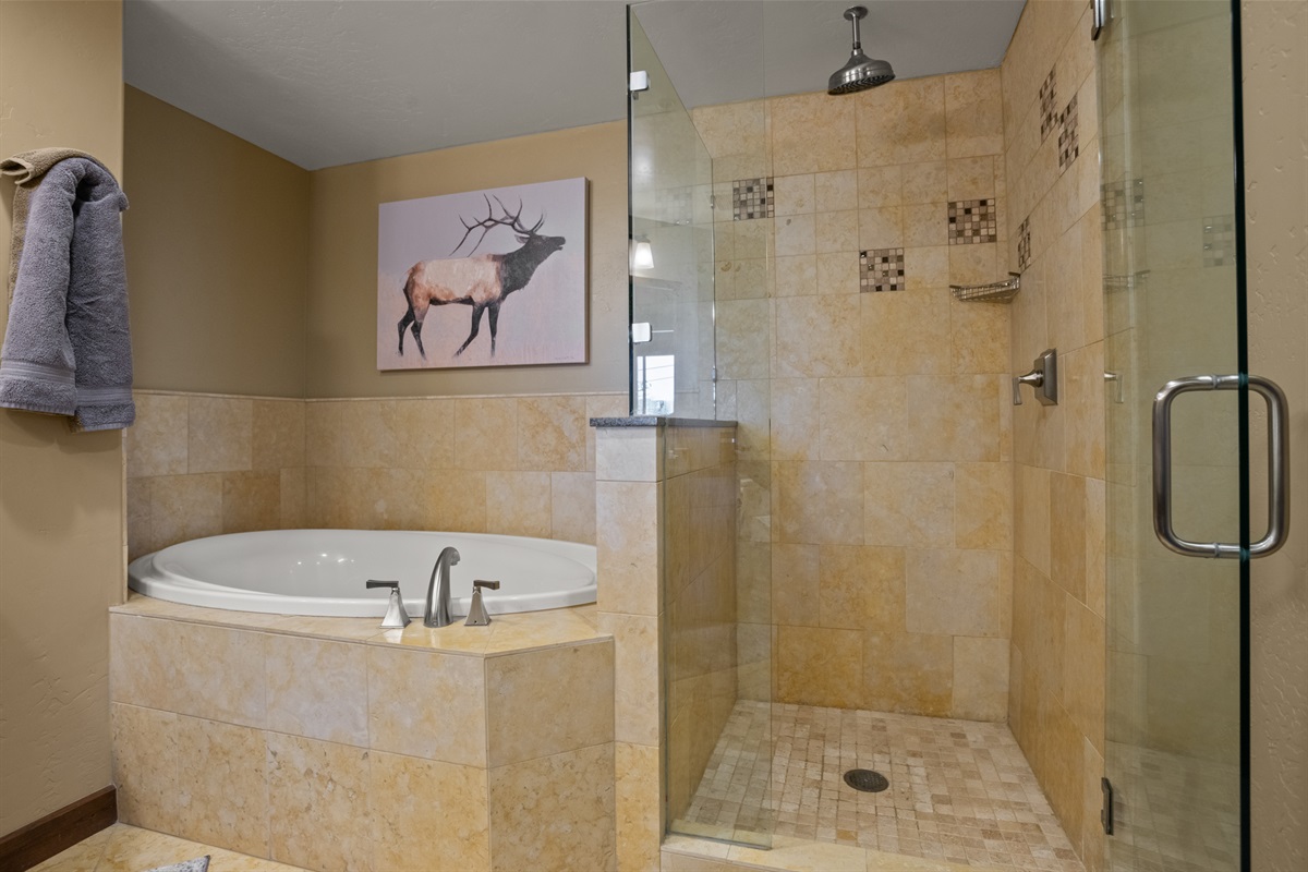 Bedroom#1 – King Bed, HDTV, Ensuite Bathroom (bidet equipped toilet, walk in shower, large soaking tub)