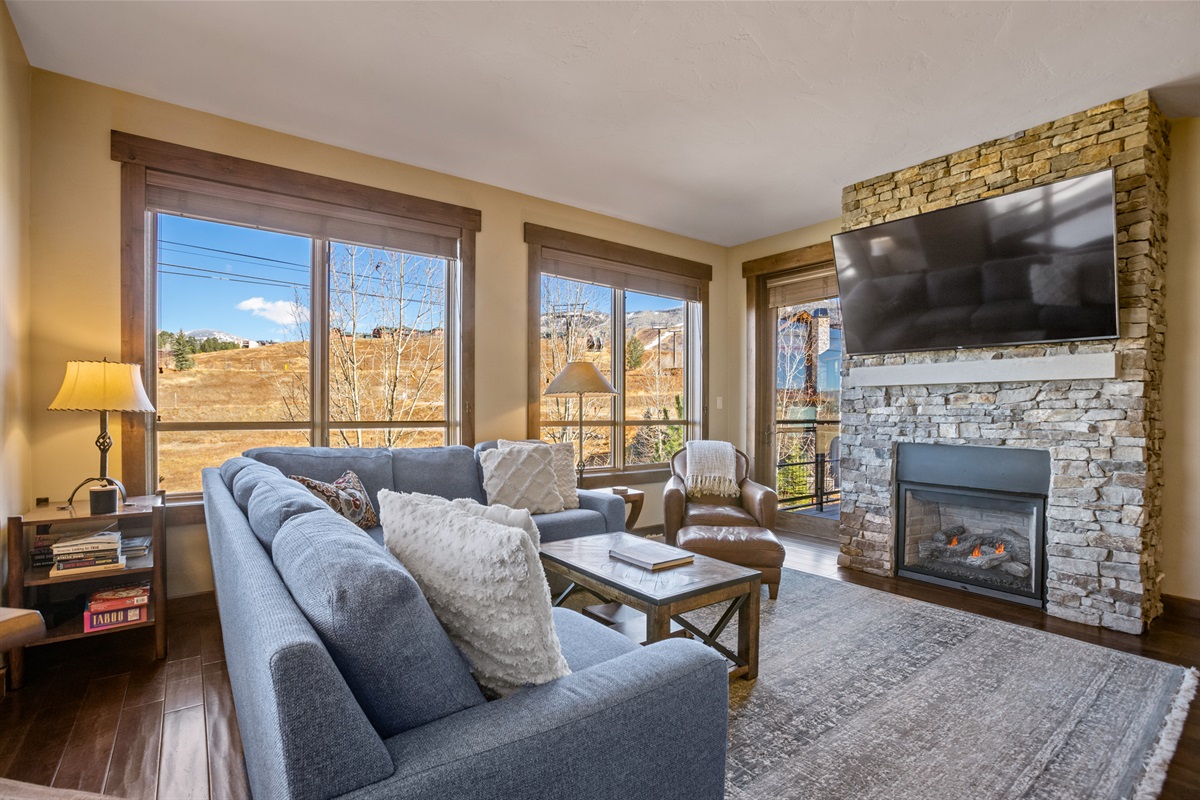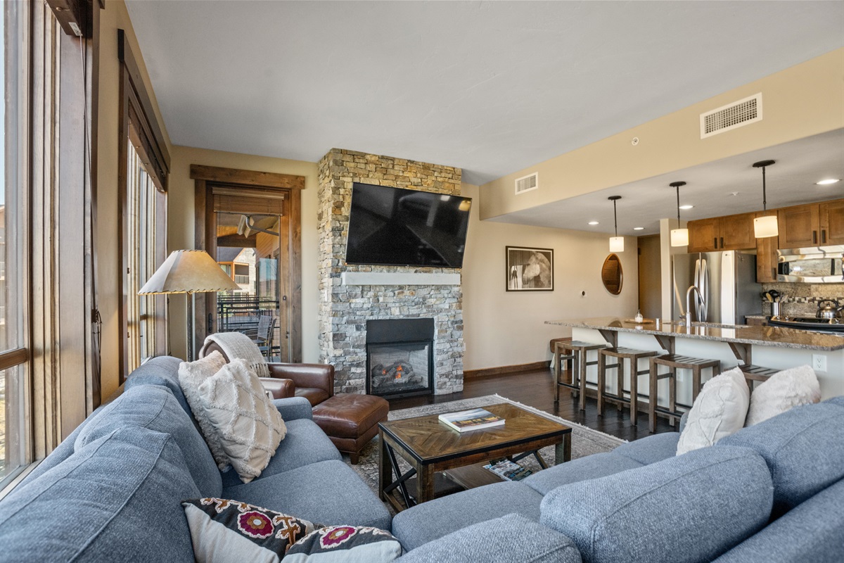 Living Area – Gas fireplace, HDTV, Balcony